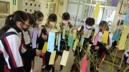 ★七夕フェスティバル★#1 公開日 2021/07/02 更新日 2021/07/02 お知らせ 昨日設置された竹に、放課後多くの生徒が短冊をつけに来ました。予想以上の盛り上がりに、生徒会執行部も嬉しそうでした。我慢が続きなかなかイベントができない中、こうした季節の行事をみんなで楽しむと、日本の良さを再発見しますね。学年の垣根を越えて、生徒も先生たちもみんな素敵な笑顔でした★ とある1年生の願いごとです。「みんなのお願いが叶いますように KS」