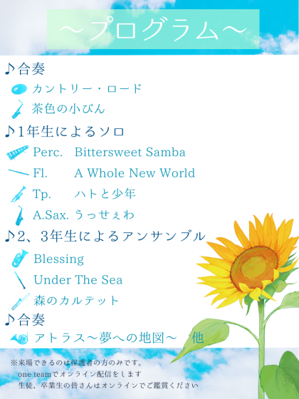 しかし、日頃より吹奏楽部を応援していただいている皆様に、少しでも私たちの音楽をお届けできるように、オンラインでも配信を行います。生徒の皆さんは、TeamsのOneTeamから参加できます。ご観覧いただける方には、アドレスまたはQRコードをお知らせしますので、吹奏楽部顧問までお問い合わせください。