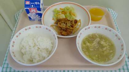 今日は渋谷区統一メニュー、ワンダフル給食の日です。油淋鶏は揚げた鶏肉に輪切りの唐辛子が入ったピリ辛のタレをかけてあります。スープには気仙沼のふかひれを使用しました。マンゴーゼリーは寒天を使用しましたが、普段はゼラチンを使用することが多いです。食感の違いに気づいたかな?