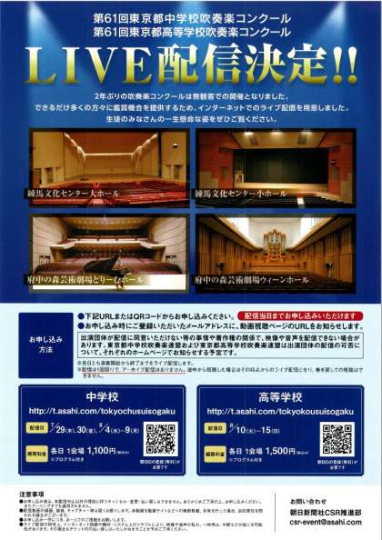 今年のコンクールも感染対策のため無観客での実施ですが、演奏がLIVE配信されます!視聴料金がかかってしまいますが、演奏者の表情も良く見えますので、会場に行けなくても楽しんでいただけると思います。吹奏楽部の応援をよろしくお願いいたします!