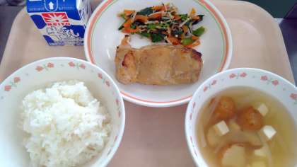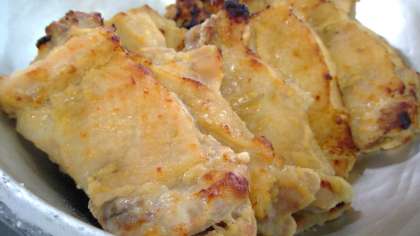 鶏もも肉をにんにく・酒・味噌・砂糖に漬けて焼いています。味噌は白味噌です。