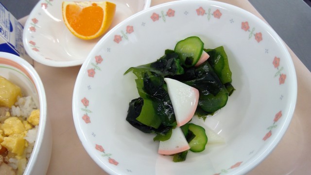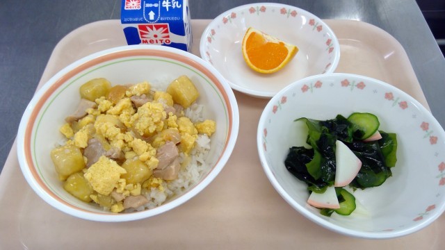 4月18日(金)の献立 公開日 2025/04/18 更新日 2025/04/18 今日の給食 ・親子丼・牛乳・きゅうりとわかめの酢の物・清見オレンジ親子丼には高野豆腐も入っています。水で戻して軽く絞り、片栗粉をつけて揚げています。酢の物は土佐酢風です。かつおだしと昆布茶を入れて、酸味を和らげました。