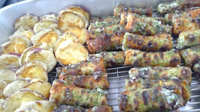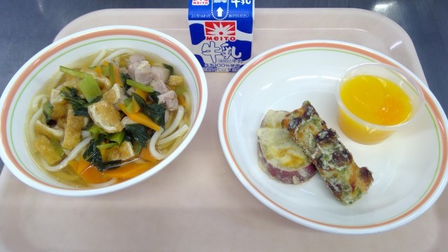 4月28日(月)の献立 公開日 2025/04/28 更新日 2025/04/28 今日の給食 ・鶏塩うどん・牛乳・いも天・ちくわ天・オレンジゼリーうどん汁はかつお節でとった出汁です。鶏肉・油揚げからもいい出汁が出ます。いも天はさつま芋を丸のまま茹でてからカットします。下茹でをすると切りやすく、揚げてもしっとりします🍠