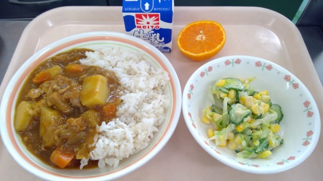 4月30日(水)の献立 公開日 2025/04/30 更新日 2025/04/30 今日の給食 ・チキンカレー・牛乳・コーンサラダ・カラマンダリンカレーは鶏もも肉と鶏ひき肉を使っています。肉に味をつけてから調理すると、煮込み時間が短時間でも味が入りやすくなります。カラマンダリンは温州みかんとキングマンダリンの交配種だそうです。皮は薄く果汁はオレンジの様な濃さです🍊