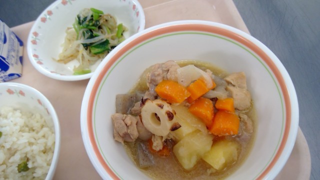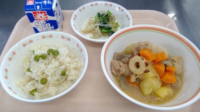 5月7日(水)の献立 公開日 2025/05/07 更新日 2025/05/07 今日の給食 ・ピースご飯・牛乳・鶏と野菜の味噌煮・青菜のナムルグリンピースを混ぜて炊いた、ピースご飯です🍚酒・薄口醤油・塩を入れて味付けています。「うすいえんどう」というえんどう豆も美味しいですが、給食では手に入りませんでした。煮物には新玉葱を使用しました。水分が多いので、出汁の量を加減して調理します。