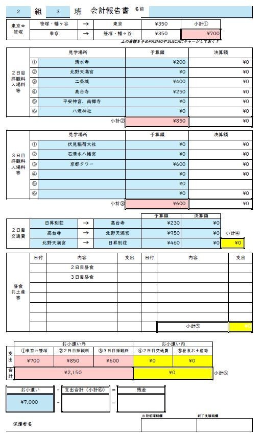 会計報告書を作成していますので、ご確認ください。また下部にサインと出発前・終了後の確認欄がありますので、そちらにご記入もお願いいたします。