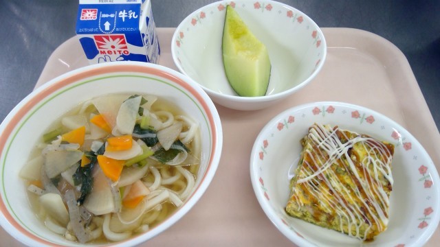 5月12日(月)の献立 公開日 2025/05/13 更新日 2025/05/13 今日の給食 ・けんちんうどん・牛乳・お好み風卵焼き・メロンうどんの汁はかつお節と昆布です。お好み風卵焼きは、キャベツ・豚肉・竹輪・紅生姜・青のりなどが入っています。ソースとマヨネーズをかけて完成です。メロンは今年初でした🍈