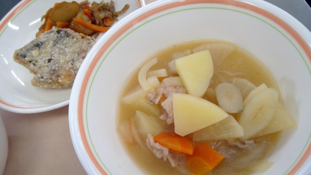5月22日(木)の献立 公開日 2025/05/22 更新日 2025/05/22 今日の給食 ・ご飯・牛乳・𩸽の利休揚げ・こんにゃくきんぴら・豚汁𩸽は酒と塩に漬けておきます。身の部分にすりごまをまぶして、その上から全体に片栗粉をまぶして揚げました。こんにゃくきんぴらは先に乾煎りをしてから調味料を加えます。そうすると短時間で味が馴染みやすくなります。