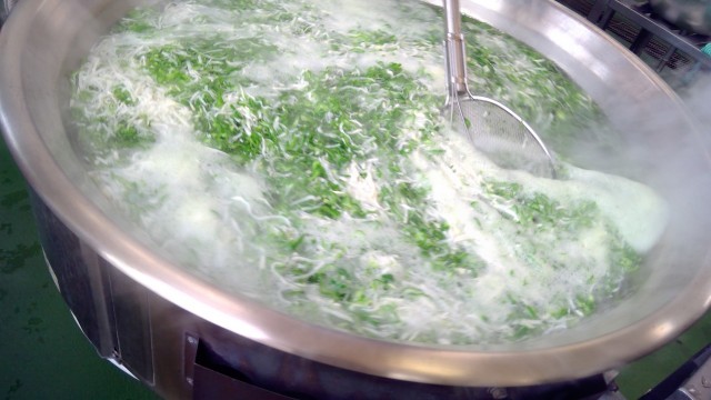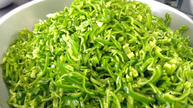 ピーマンのナムル作りです。ボイルして、水気を絞ります。カサが減るように、繊維を断ち切って千切りにしました。