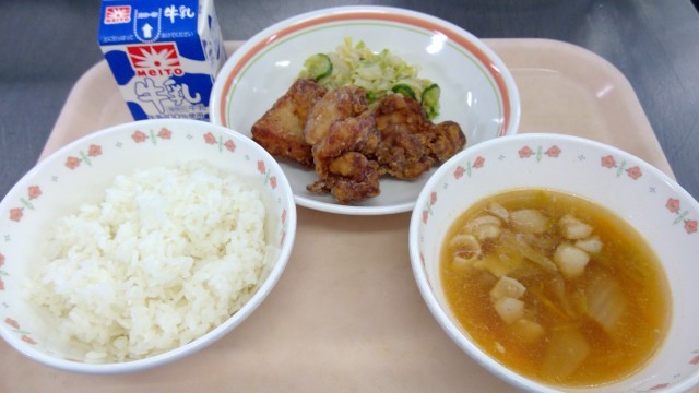 5月29日(木)の献立 公開日 2025/05/29 更新日 2025/05/29 今日の給食 ・ご飯・牛乳・鶏の唐揚げ・ごまドレサラダ・キムチスープ鶏の唐揚げはたんぱく質を多くして脂質を下げるために、皮なしのもも肉を使用しました。様々なレシピのある唐揚げですが、今日は米粉と片栗粉をまぶして揚げました。