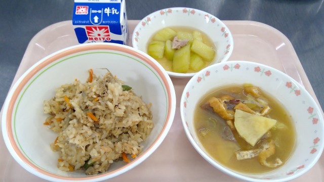 6月6日(金)の献立 公開日 2025/06/07 更新日 2025/06/07 今日の給食 ・五目ツナご飯・牛乳・加賀太胡瓜の煮物・五郎島金時の味噌汁加賀野菜の【加賀太胡瓜】と【五郎島金時】を使用しました。さつま芋と同じくらいの大きさの胡瓜が届きました。ご飯にはツナ・人参・えのき・いんげん・ごぼうを醤油で炒めて加えています。