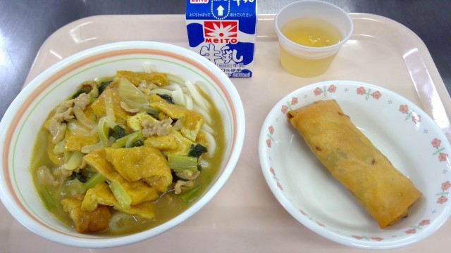 6月10日(火)の献立 公開日 2025/06/10 更新日 2025/06/10 今日の給食 ・カレーうどん・牛乳・五目春巻・梅ゼリーカレーうどんの出汁はかつお節です。いつもの味噌汁より濃い出汁をとっています。春巻は通常の具材にめかぶを加えました。特有のねばねばは揚げると消えてしまいます。6月は梅の季節なので、梅シロップを使ってゼリーを作りました🍮そろそろ梅雨ですね☔