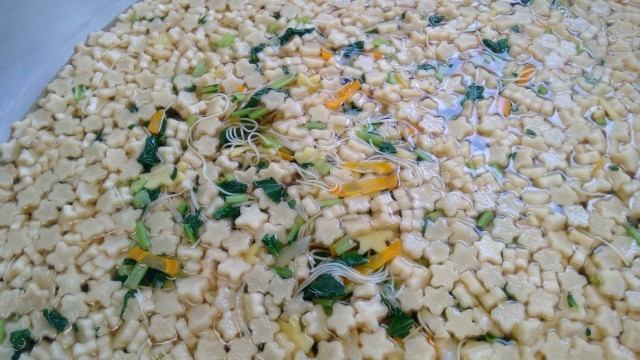 織姫が機織りの名人という説から、七夕献立にはそうめんを取り入れることが多いです。今日はすまし汁に星形のお麩と一緒に入れました。