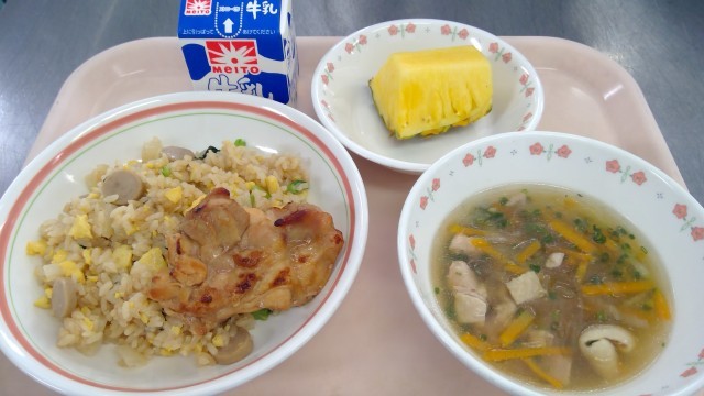 7月8日(火)の献立 公開日 2025/07/08 更新日 2025/07/08 今日の給食 ・フライドライス・牛乳・フリフリチキン・チキンロングライス・パイナップル今日はハワイ献立です。渋谷区とハワイ州ホノルル市は令和6年5月31日に姉妹都市協定を結びました。今年度も渋谷区立の小中学校ではハワイ献立が提供されています。フリフリチキンはタレをつけながら焼く丸鶏のことだそうです。今日は教えて頂いたレシピを参考に、鶏もも肉を味付けて焼きました。ロングライスは春雨のことです。