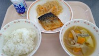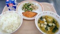 ・ご飯・牛乳・鮭のガーリックソテー・鶏と胡瓜の辛子和え・すまし汁鮭をおろしにんに...