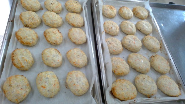 写真2枚目はれんこんハンバーグです。鶏むね肉を使用して玉ねぎ・人参・れんこんなどの具材を混ぜ合わせて作りました。鶏肉を使用しているので焼き目はそこまで付きませんが、甘めに味付けをした、たれと良く絡みさっぱりと食べれます。