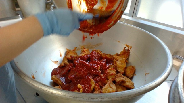 写真2枚目はヤンニョムチキンの調理の様子です。鶏肉を油で揚げた後に甘辛い特製のたれを絡めます。午前中の校舎にはヤンニョムチキンの食欲の沸く香りがしていました。