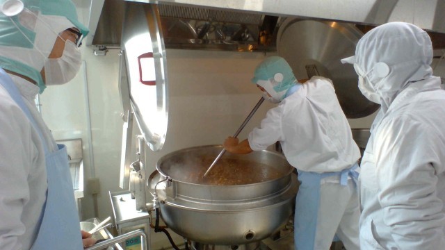 服部学園でシェフに教えていただいたレシピを再現するために、調理員さんと栄養士で細かく味のチェックをして完成させていきました。(写真2枚目)何人かの生徒からは何が入っているのかという質問もありました。普段の献立にはあまり使わない食材や味に興味を持ってくれている生徒も多く、みなさん楽しんで食べていました。