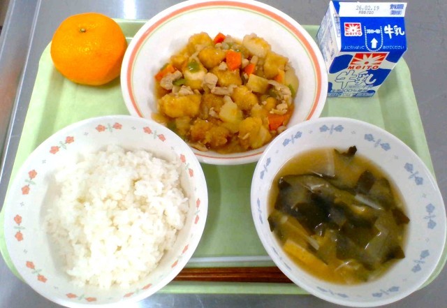 メカジキはくせの少ない味とやわらかい身が特徴の魚です。火を通してもくずれにくく、煮物や焼き物、フライなど様々な料理で使われています。旬は冬から春にかけてで、この時期は脂がのり、うま味も増します。たんぱく質が豊富で成長期に大切な栄養素が取れるのも特徴です。食べやすい魚として給食でも人気があります。今日の給食では、衣を付けて油で揚げたメカジキを、じゃがいも・人参・玉ねぎ・鶏肉などの食材を煮たものと合わせて完成します。みかんの品種は青島みかんでした。実が大きなみかんで甘くてジューシーでした。