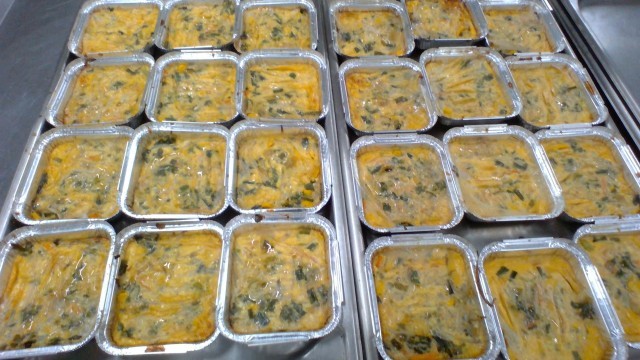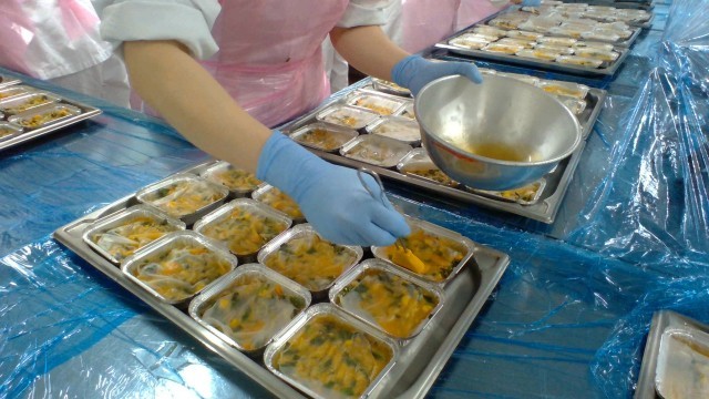 2枚目3枚目の写真は、麩とライスペーパーのチヂミ風の調理の様子です。今回はひとり分ずつアルミのお皿に入れて作りました。炒めた野菜の上から卵に砕いた車麩・だし・調味料などを混ぜ合わせたものを流し入れ、その上に水で濡らしたライスペーパーをのせてオーブンで焼いて作りました。食べるときには、たれをかけて食べます。今日の給食を楽しみに待っていた生徒さんも多く、2年生は全クラス完食していました。1年生も、もう少しで完食でした。