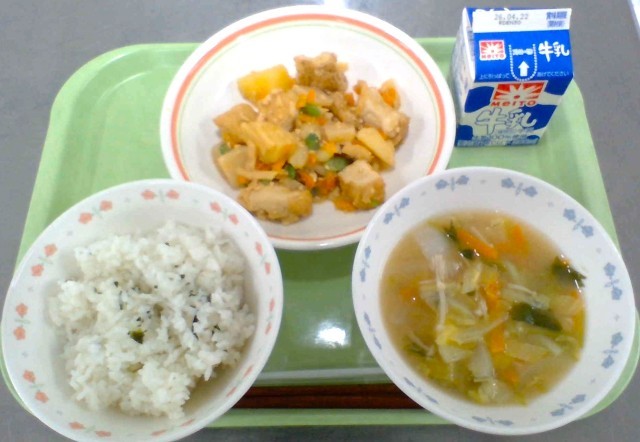 なかでもこの時期に出回る「新じゃがいも」は、皮がうすく水分が多いのが特徴です。今日は煮物にしました。煮物にすると味がしみこみやすく、やわらかく仕上がります。ビタミンCも含まれ、成長期のみなさんにうれしい野菜です。旬の味を楽しみましょう。