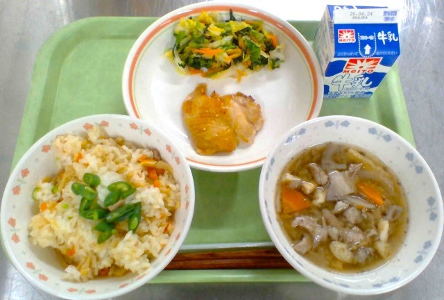 たけのこは土の中で育ち、えぐみが少ない若いうちに収穫される春の味覚です。食物繊維が豊富で、おなかの調子を整える働きがあります。また、カリウムを含み、体の余分な塩分の排出を助けます。給食でも、春ならではの風味と食感を味わってください。
