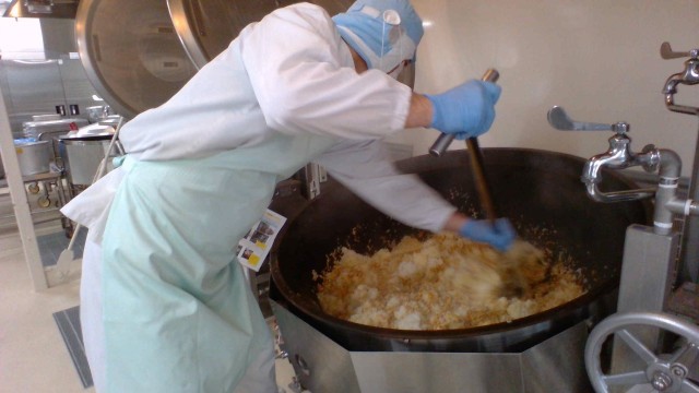 一度にたくさんの量が混ぜられるように大きな釜を使用して作ります。1つの釜で約200人分のご飯を混ぜていきます。重量もあるのでかき混ぜる作業もとても力が要ります。ムラがなく味が均等になるように丁寧に調理しています。