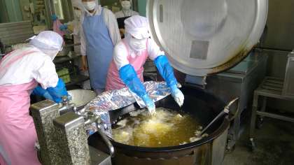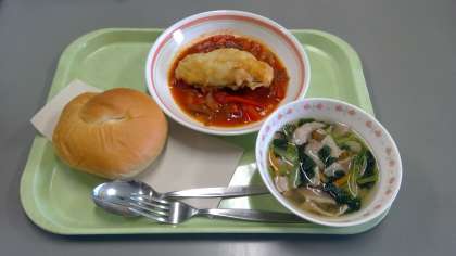 渋谷区の小・中学校で行われているワンダフル給食でした。今日は、ご協力いただいている服部栄養専門学校の先生方が、調理室の様子を見にきてくださいました。色々なアドバイスをいただき作りました。
