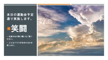 お天気に恵まれ無事に開催することができます。朝食をしっかり取って精一杯応援しましょう。そして、全力で闘いましょう。皆さんが最後にやり切ったと思うことが大切です。楽しみにしています。