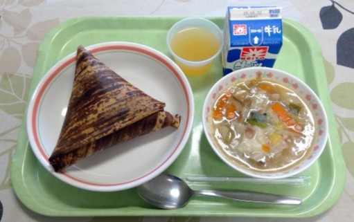 今日の給食のちまきは、給食室でみなさんの健康と幸せを願い、一つひとつ竹の皮に包んで作りました。