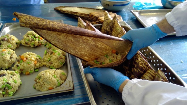 お米はもち米を使い、炒めてから竹の皮に包み、蒸し上げます。