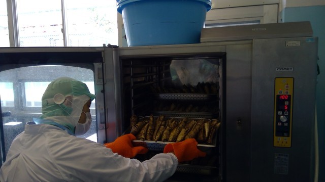 今日の給食室では、朝早くから、ちまきを作る作業をしていました。