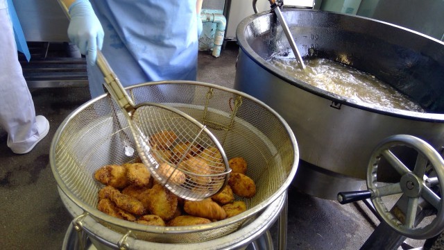 給食のコロッケは、すべて手作りの揚げたてです。今日も美味しく出来上がりました。