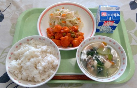 今日のメニューの『いかのチリソース』はピリ辛な味付けで好評でした。