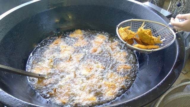 写真の2枚目は鰺フライを揚げている様子です。