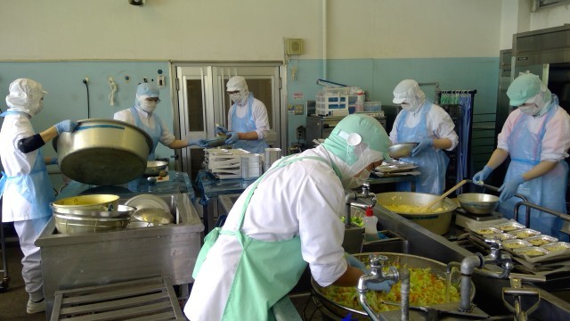 大きな釜を沢山使ったり、オーブンや炊飯器などを使う給食室はとても暑くなります。
