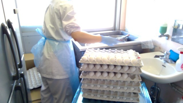 たまごの量は22Kgで約370個くらいです。卵を一つひとつ割るだけでも時間のかかる作業です。