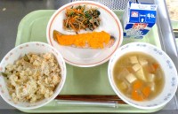 今日の献立●さつまいものかき揚げ丼●かぶのおかか和え●きのこのみそ汁●牛乳日本に...