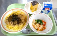 今日の献立●練馬スパゲッティー●アップルソースサラダ●さつま芋と黒ゴマのケーキ●...