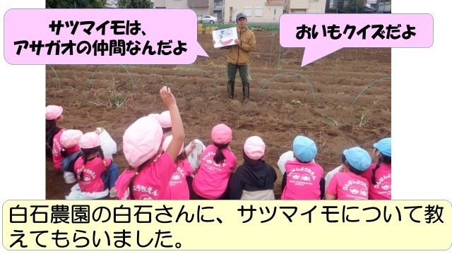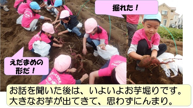「あと何回寝たら遠足?」と日を数えて楽しみにしていた芋ほり遠足。雨にも降られず、芋畑に行くことができました。