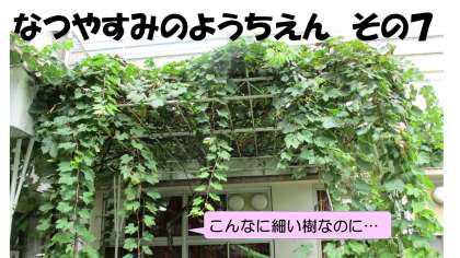なつやすみのようちえん その7 公開日 2021/09/02 更新日 2021/09/02 臨川幼稚園の子供たち なつやすみのようちえん〜その7 ぶどう〜 玄関前の「ぶどう」もこんなにツルを伸ばしています。 すみれ組さんのサツマイモに絡む勢いです! 今年も、たくさんの実をつけていますよ。 幼稚園が始まったら、見上げてみてね。 紫色に色付いてきたら「ぶどう狩り」です! 10月の終わりごろかな…楽しみですね♪