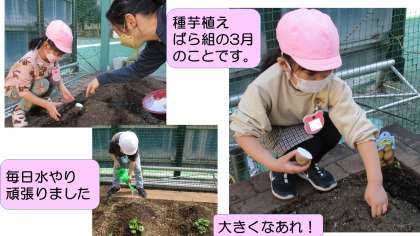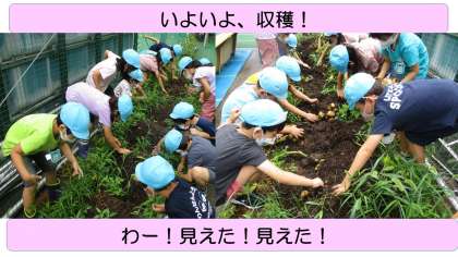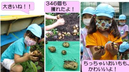 とれたよとれた!346個もとれたよ! 公開日 2022/08/26 更新日 2022/08/26 臨川幼稚園の子供たち すみれ組が、ばら組の3月に植えたジャガイモ。 すみれ組に進級してからは係の仕事として、水やりをし、雑草をとり、収穫する日を楽しみに、毎日お世話をしてきました。 7月中旬、いよいよ収穫です。 とれたジャガイモの数は、なんと全部で346個! やったね!大成功! 今年も調理、会食ができず残念ですが、おうちでおいしく食べたのでしょうね。 ぜひレシピを教えてね!