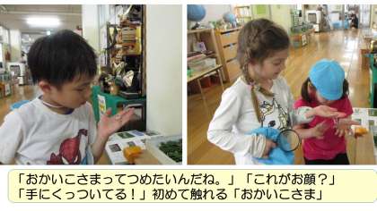 さっそく手に乗せるとじっと顔を見て「くすぐったい」「冷たいね」「どれが目かな」など待ちに待った「おかいこさま」に触れられる瞬間に心躍らせる姿が見られました。
