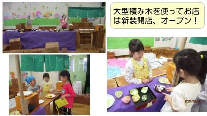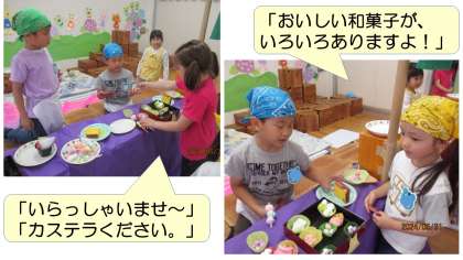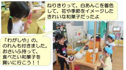 わがしやさん〜すみれ組〜 公開日 2024/06/11 更新日 2024/06/11 臨川幼稚園の子供たち ごっこで遊びを楽しんできたすみれ組。 他の物も増やして「和菓子屋さんにしよう」と言い出しました。 「和菓子屋さんって何売ってるの?」ネットで調べてみると、 「羊羹、まんじゅう、ねりきり・・・ねりきりって何?」と、馴染が薄い菓子が出てきて、本でも調べてみました。 「いろいろあるんだね」本物らしく作るために素材を選び始めましたよ! 「何を作る?」「私、これ!」