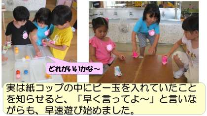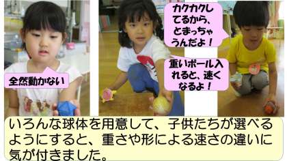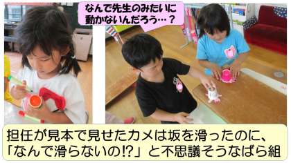 かめ&かたつむりの散歩〜ばら組〜 公開日 2024/06/11 更新日 2024/06/11 臨川幼稚園の子供たち かめ&かたつむりの散歩〜ばら組〜その1 生き物が大好きなばら組! 園で飼育しているカメや、友達がみつけた小さなカタツムリにも興味深々! そこで、甲羅や殻に見立てた容器に好きな色を塗って、顔を付けて、カメやカタツムリを作りました。 「どうやったら動くかな?」「早く動かすにはどうしたらいいのかな?」と試行錯誤しながら、遊んでいます。