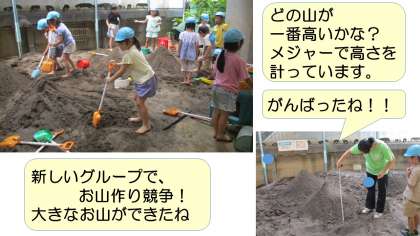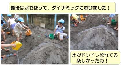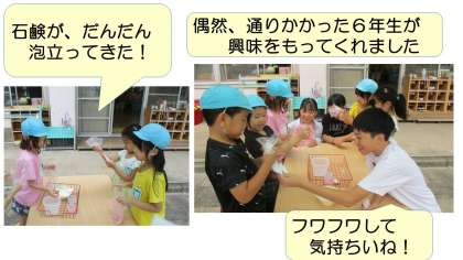 そこで、石鹸の泡立て遊びや裸足で砂場遊びをしました。