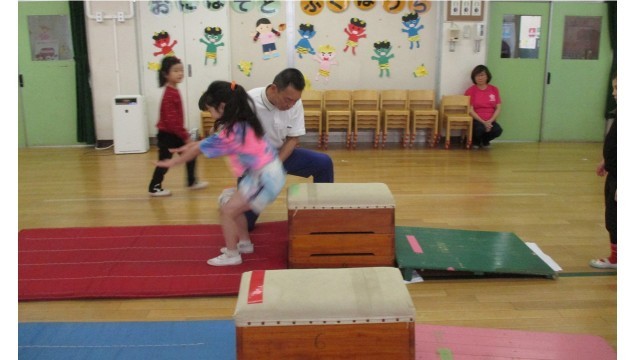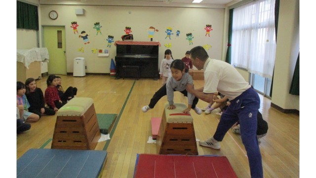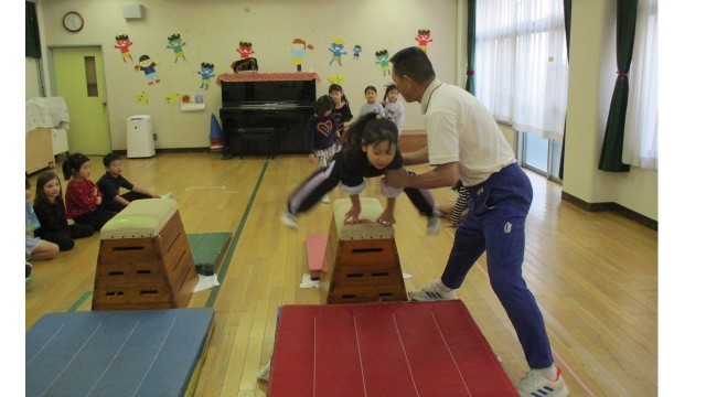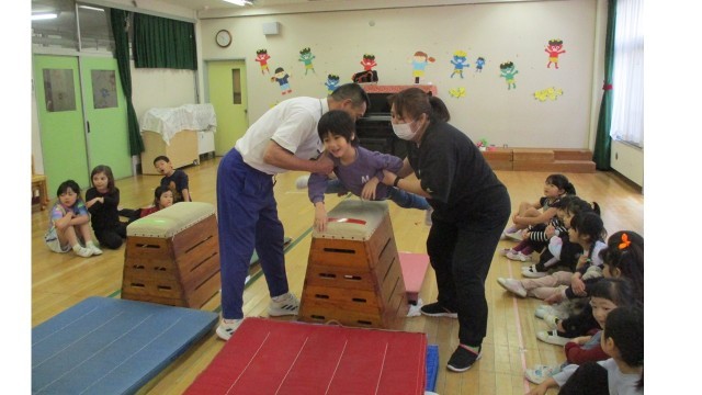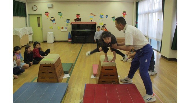 「みんなで跳び箱に挑戦しよう!」と教師が言うと「出来るかな?」とちょっと不安そうな子もいましたが、低い段から練習を開始し、鶴岡先生に跳び終りの姿勢も両手を肩の高さにすることが大切と教えてもらい、意識して立ちました。
