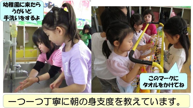 すみれ組は少し早く登園し、ばら組の朝の身支度のお手伝いをしています。
