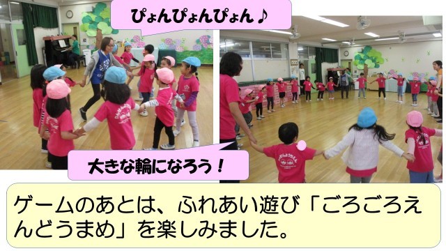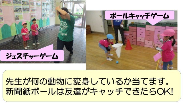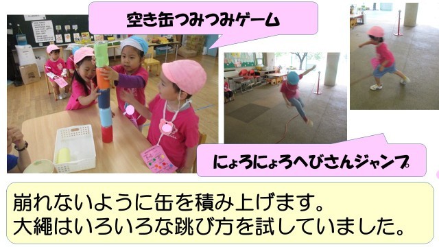 遠足ごっこ②~幼稚園遠足~ 公開日 2025/06/15 更新日 2025/08/08 臨川幼稚園の子供たち 遠足ごっこ後半は幼稚園の中で、ペアのお友達とゲームコーナーを回りながら楽しみました。カードに書かれたミッションに挑戦して、できたらシールをもらいました。そして成功する嬉しさをいっぱいに感じていました。雨天で有栖川公園には行けませんでしたが、幼稚園での遠足ごっこもとても楽しかったですね! +4