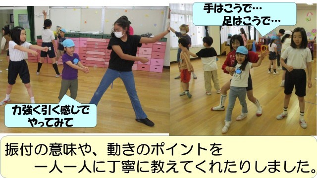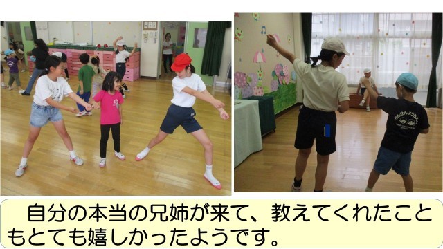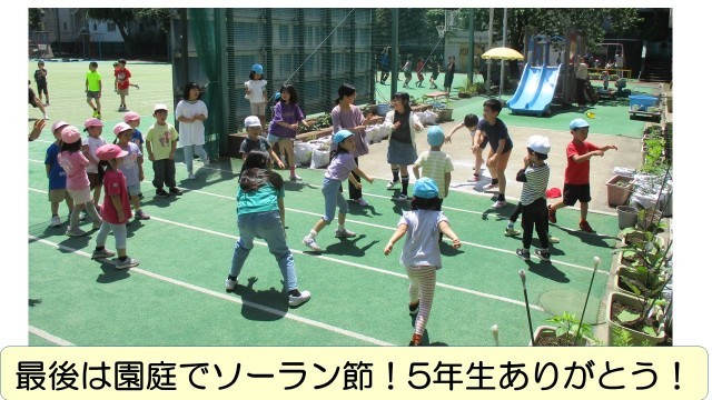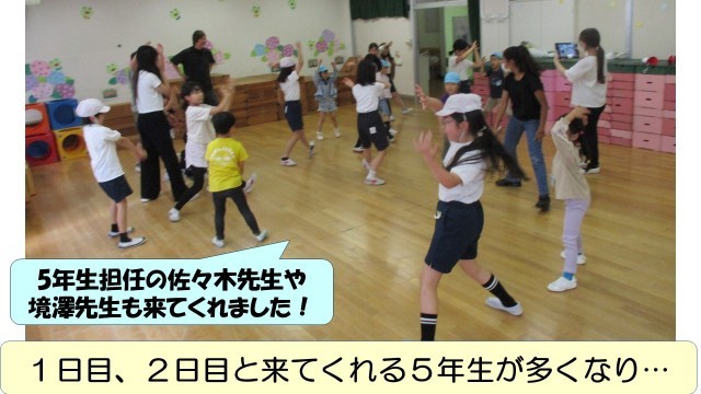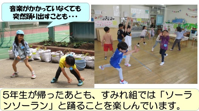 5年生とソーラン節 公開日 2025/06/15 更新日 2025/06/15 臨川幼稚園の子供たち 5月、どこからともなく聞こえてくるソーラン節の調べ。小学校の運動会リハーサルで高学年のソーラン節を見ると、「ソーラン節踊りたい!」とすみれ組で踊り始めました。でも振りがわからないところが多く、「ソーラン節を教えてください」と5年生にビデオレターを送りました。するとそれを見た5年生が中休みに教えに来てくれました。 +3